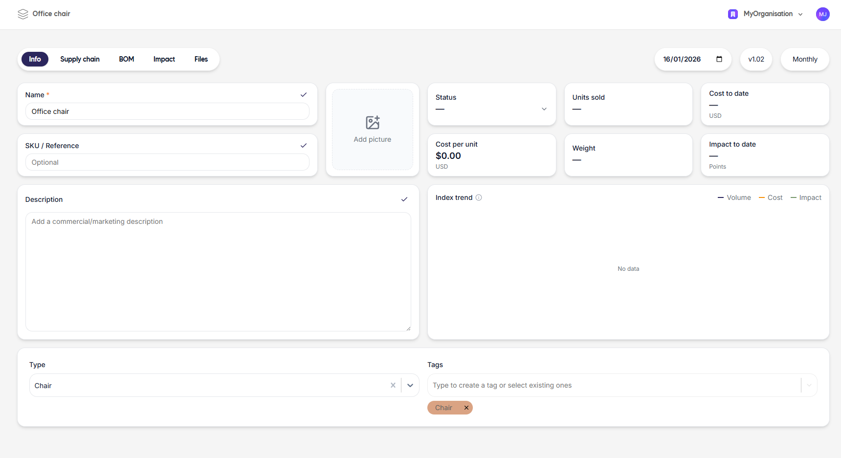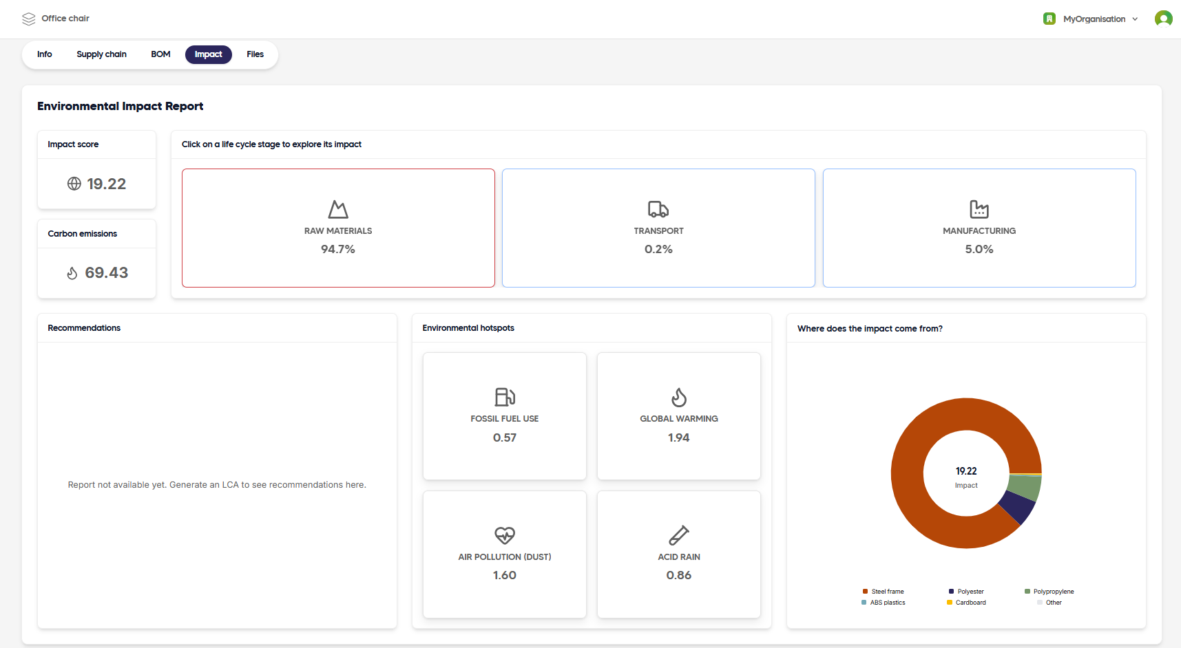 - Goal: To quantify the environmental impacts of an office chair across its entire life cycle and identify which materials and components contribute the most to these impacts. The assessment is conducted using the BOM of the product in Sustainly.