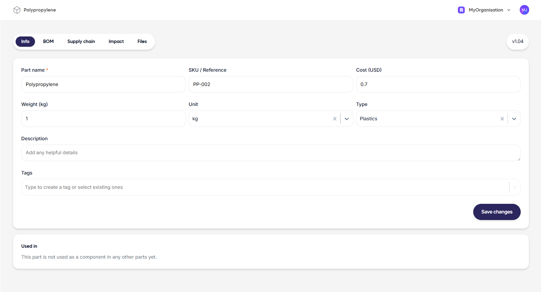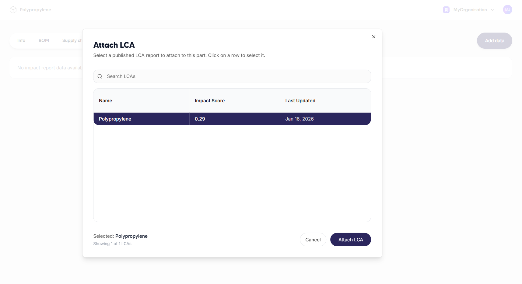 The environmental impacts of the production of 1 kg of polypropylene are now linked to this specific part and can be scaled when used in an assembly.