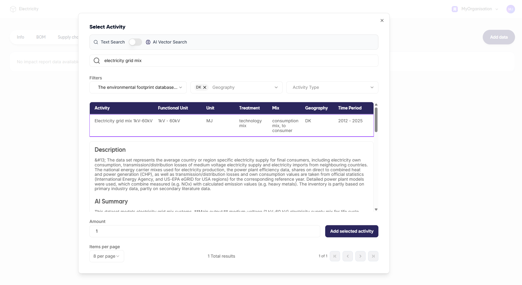 Search for the relevant dataset in your LCA database: in this case, choose “Electricity grid mix 1kV-60kV” with DK as geographical location