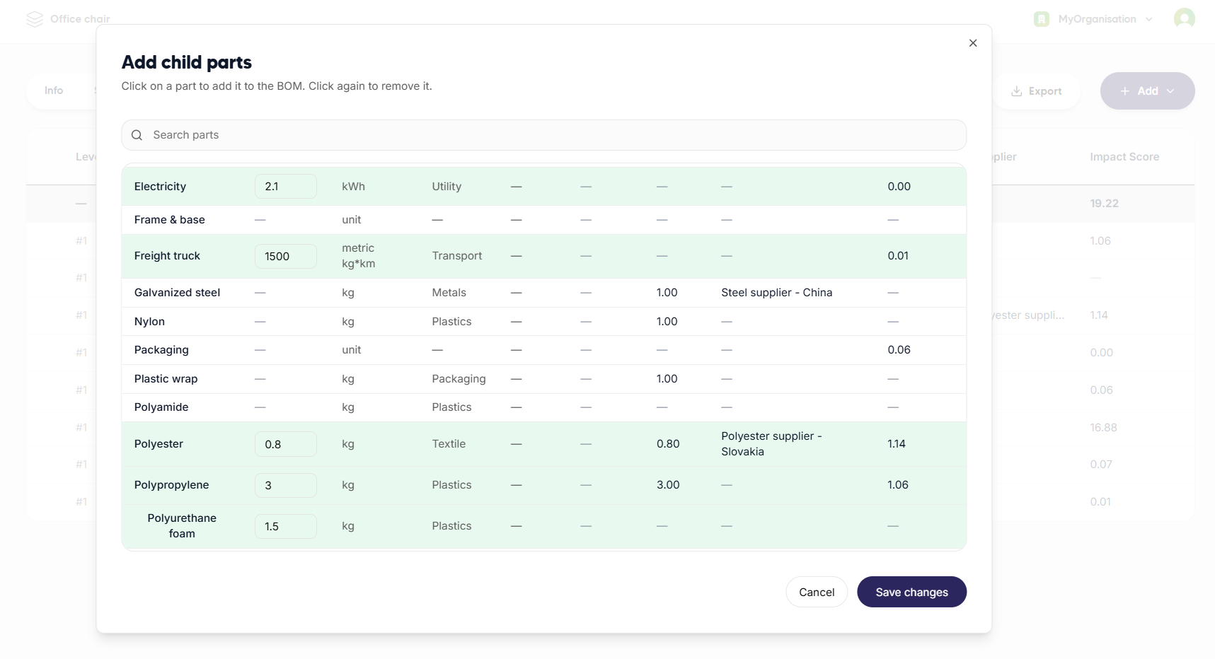 This tutorial provides an advanced, step-by-step guide on how to calculate the environmental impacts of a product using its Bill of Materials (BOM). As an example, we will model an office chair and quantify its environmental impacts in Sustainly, using a scalable and reusable modelling approach.